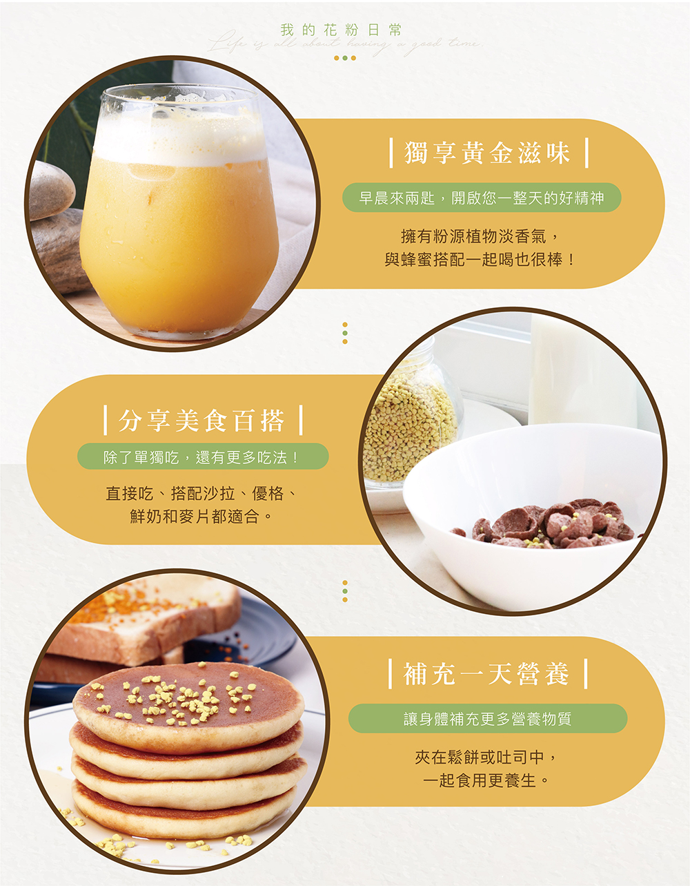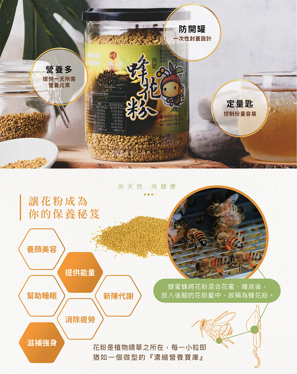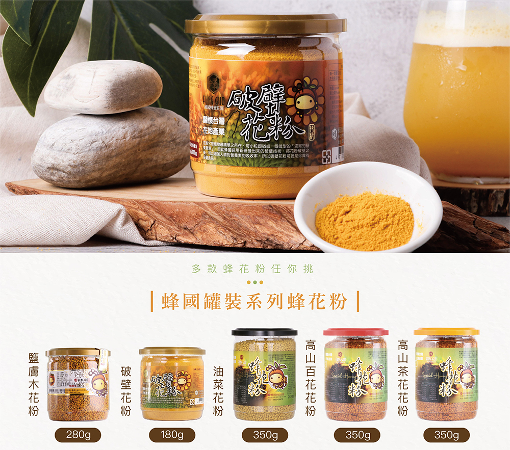 蜂花粉 350g 系列 任選「買4送1 」 產品編號: 常溫宅配 *植物精華、營養寶庫 *⼝感酥脆、自然香甜 *天然保健、養顏聖品 !請備註所選花粉及數量 規格 1組 數量 - + 加入購物車 立即結帳 本商品適用活動 優惠活動 免運專區商品優惠 優惠活動 加購商品 [加價購] 蜂蠟防蚊霜20g 原價$180 1 2 3 4 5 6 7 8 9 10 加購價 $130 [加價購] 蜂蜜梅精50g 原價$120 1 2 3 4 5 6 7 8 9 10 加購價 $100 [加價購] 糯米荔枝乾200g 原價$220 1 加購價 $188 上一筆 回到列表 下一筆
