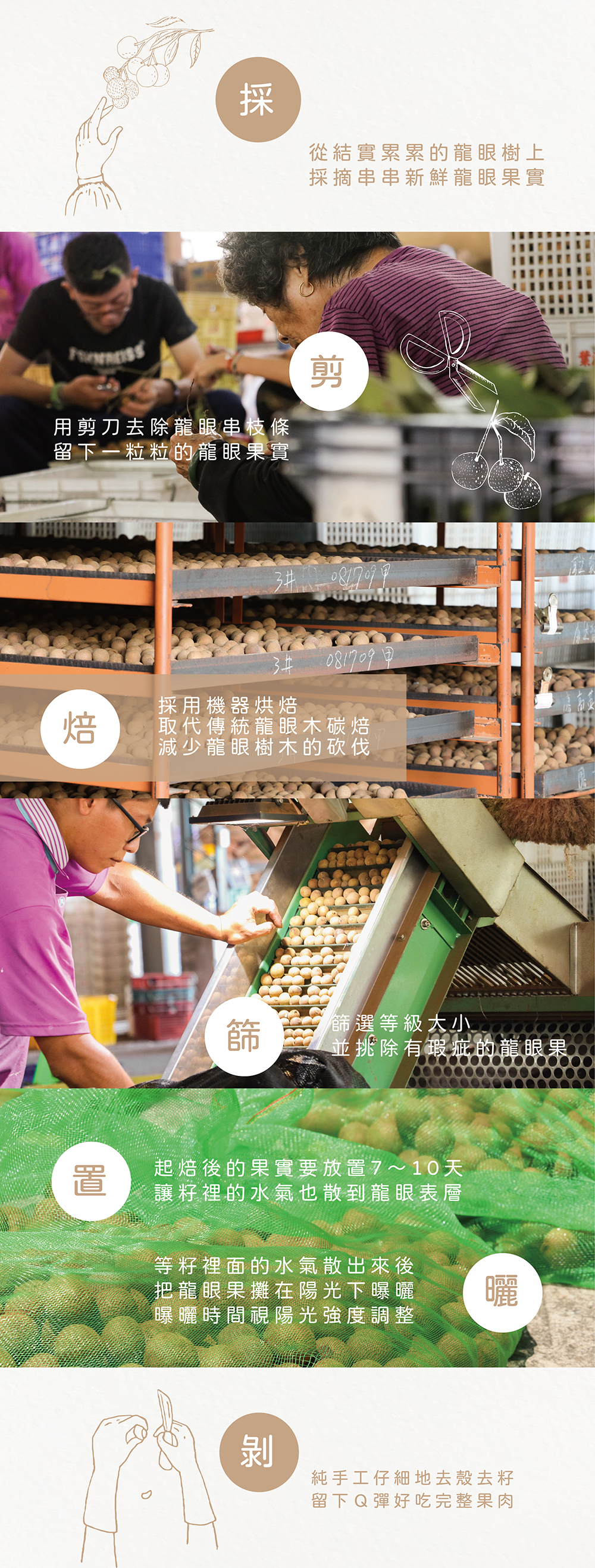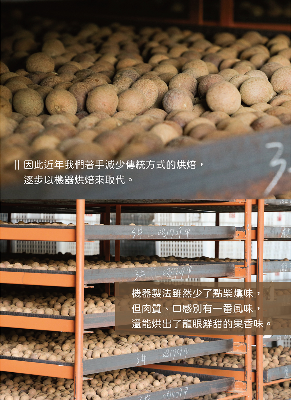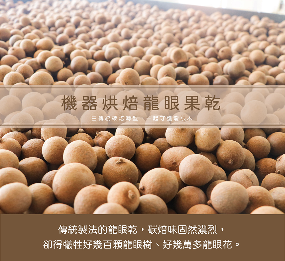 雖然南投中寮盛產龍眼樹,但仍不及被砍伐消失的速度,因此我們逐漸轉型改為機器烘焙的⽅式,無形中拯救了好幾百棵龍眼樹,機器烘焙還可以讓每顆龍眼乾擁有更厚實、Q彈飽滿的肉質,凸顯濃厚果香味。