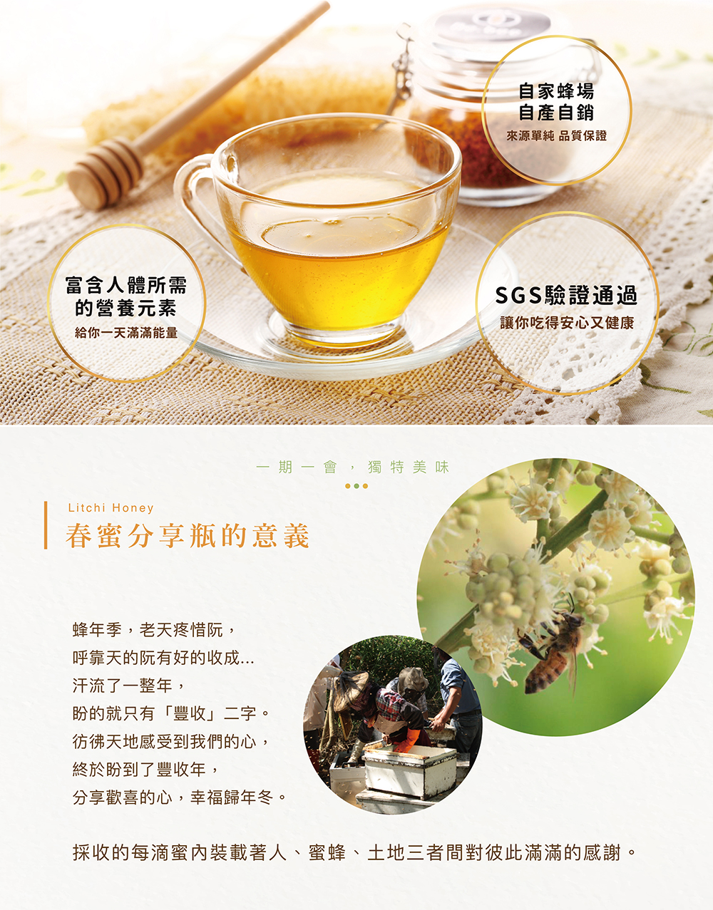 採自春季盛開的荔枝花,好天氣釀出豐收好蜜,抱著滿滿的感謝,透過分享春蜜,將這份幸福感傳給您,品好蜜,甜心裡。
