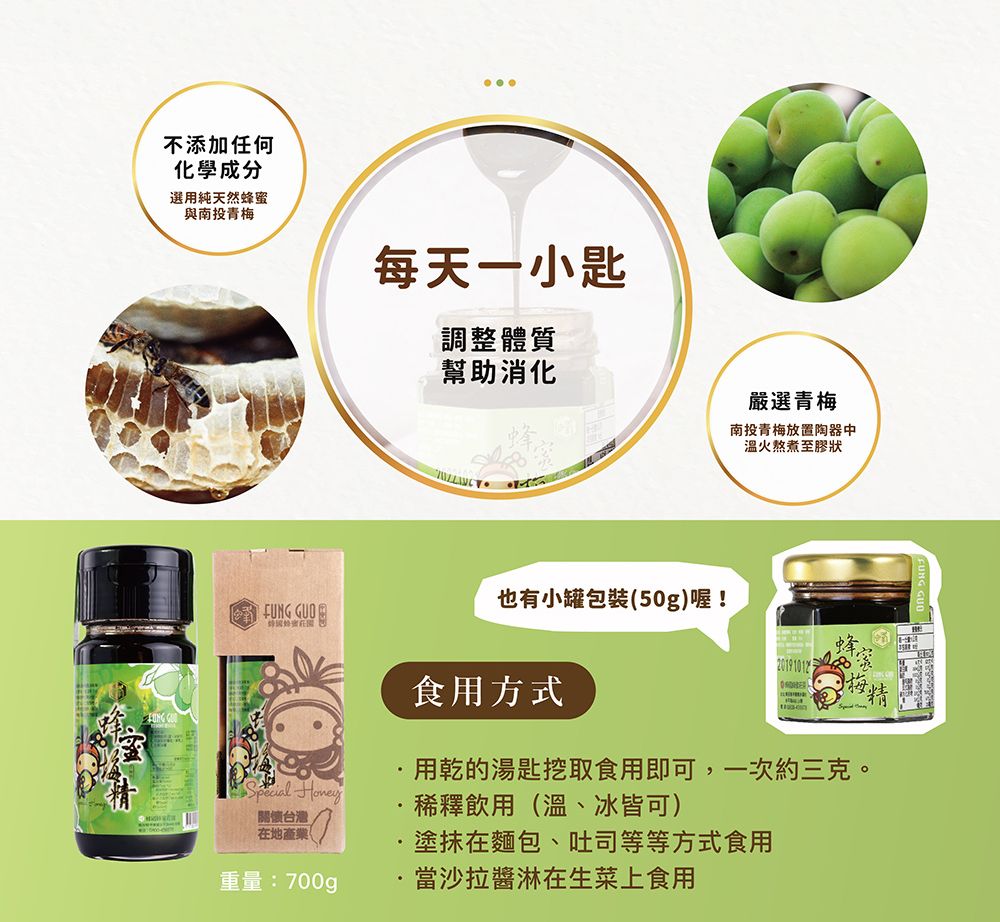 嚴選南投的青梅,放在陶器中溫火熬煮至膠狀,經30倍濃縮再加上天然蜂蜜調配⽽成,過程完全不含化學添加物。蜂蜜梅精是鹼性食品,有調理⾝體、幫助消化,酸酸甜甜的好吃⼜開胃。